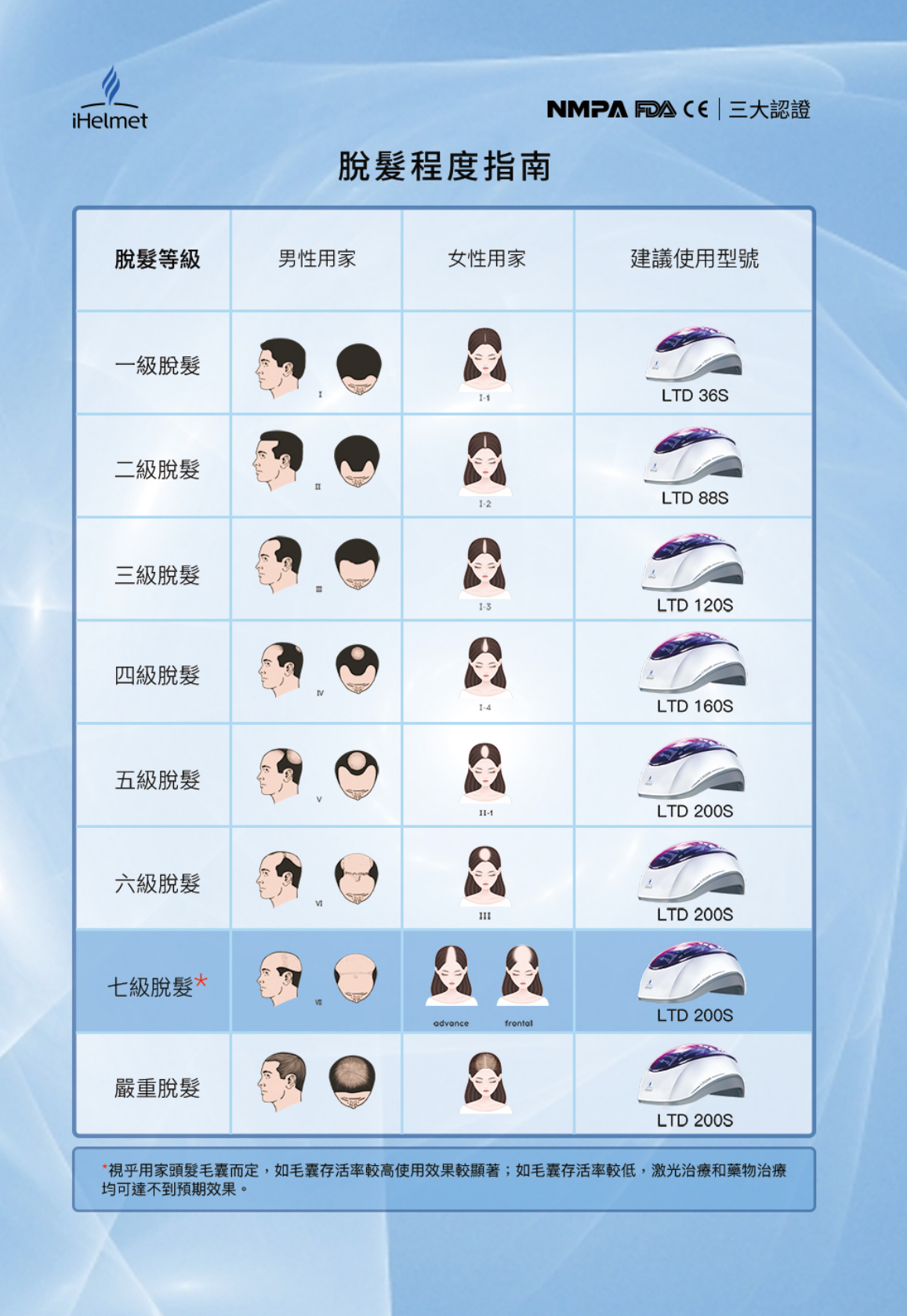 A︰iHelmet:適合在雄激素性脫髮的早期和中期(男性 I-V 型和女性 I-II 型)使用,亦適合以下情況人士使用︰因壓力或產後造成的脫髮、化療後的脫髮、治療斑禿、治療非病理性脫髮,如先天性頭髮不好,頭髮精神壓力引起的營養不良或脫髮問題。