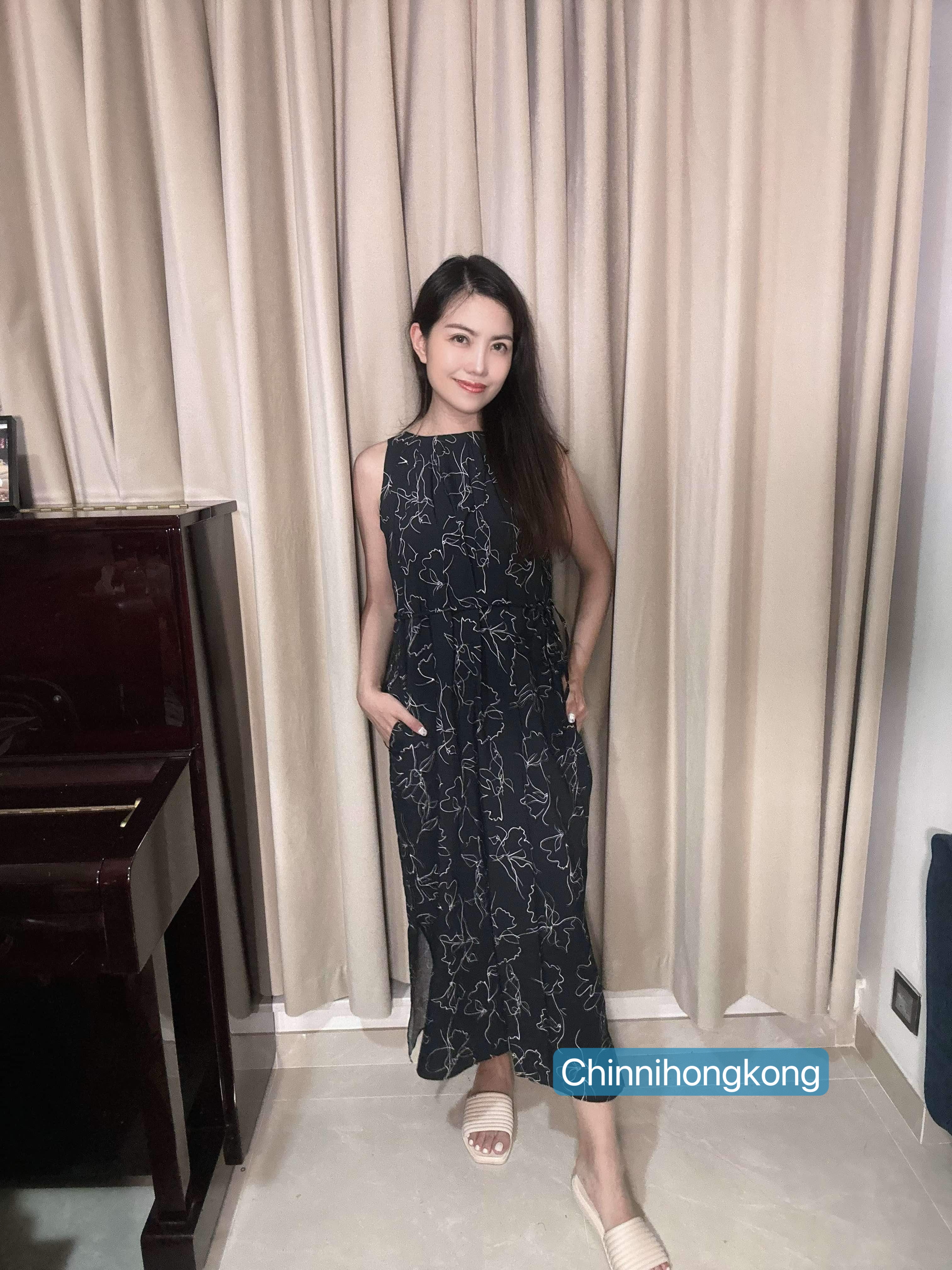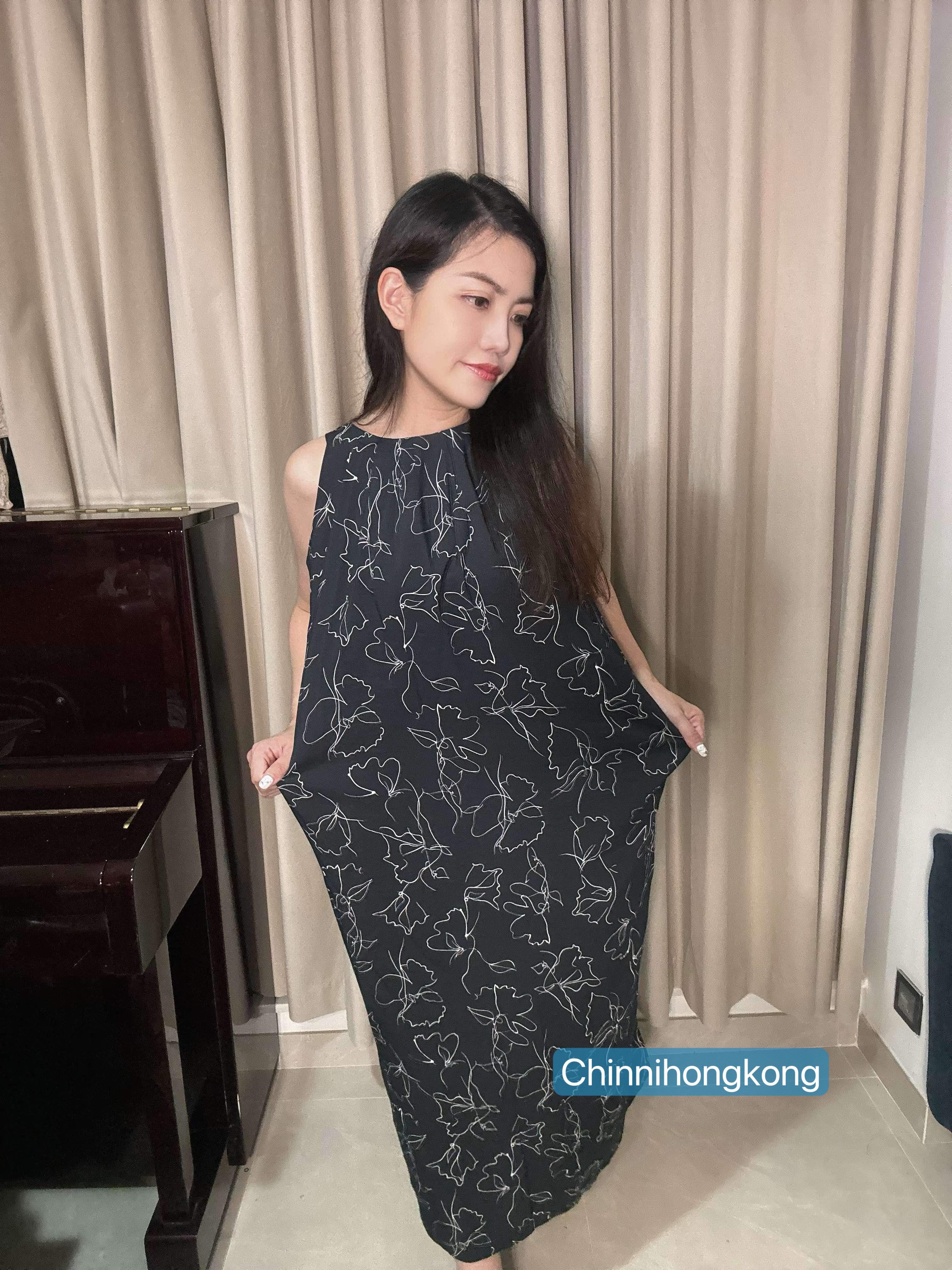黑色印花百摺背心連身長裙(附幼腰帶)