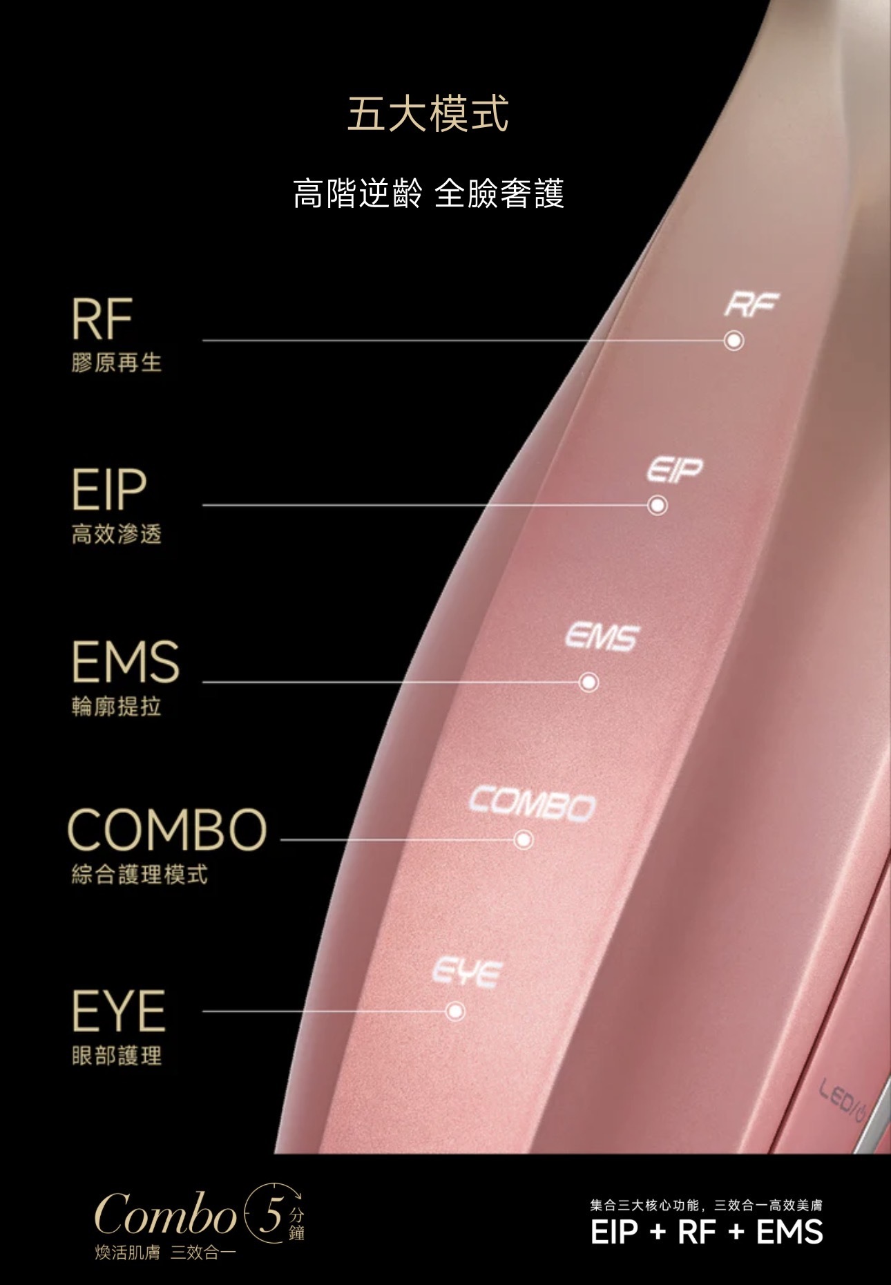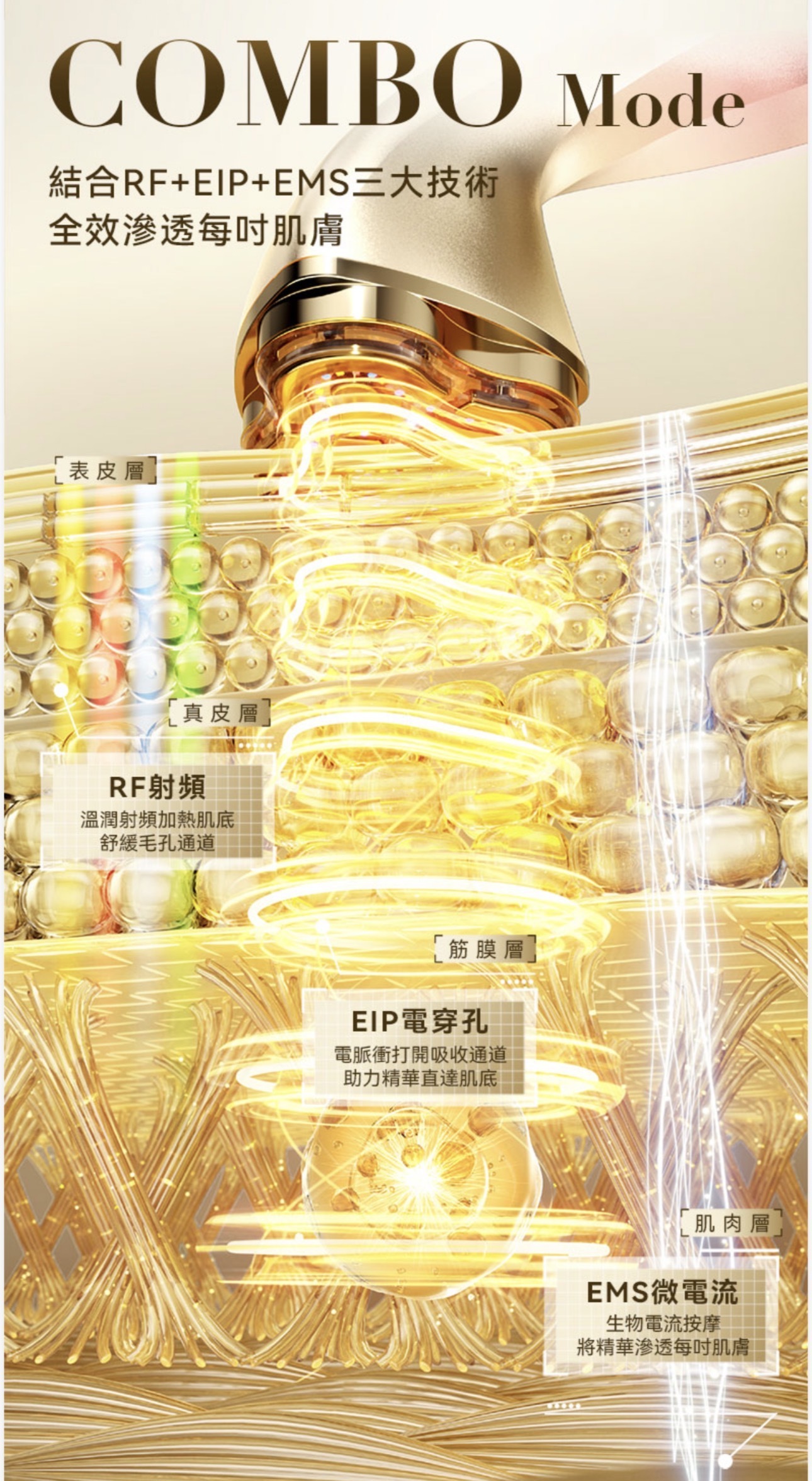 集合RF 、EIP、EMS三種功能,交替功能輸出。適合繁忙⼈⼠使⽤,短時間内達成護膚、美容效果