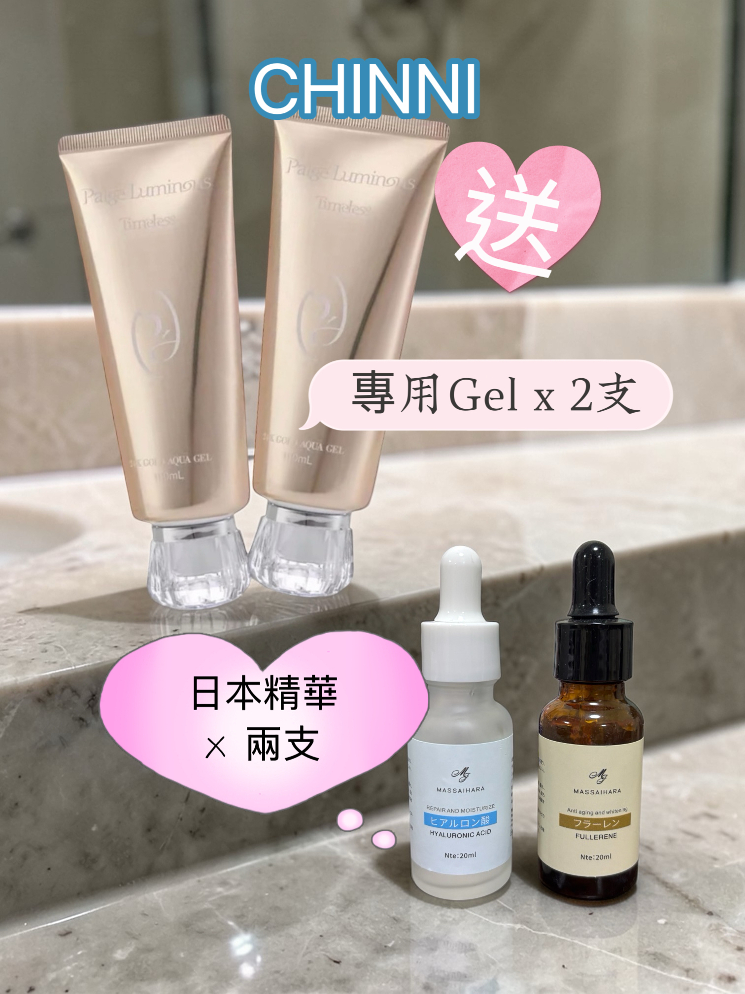 潔面後,用日本水光精華全面打底,再厚敷金箔Gel,然後用Combo模式全面推5分鐘(由下而上/由內而外)